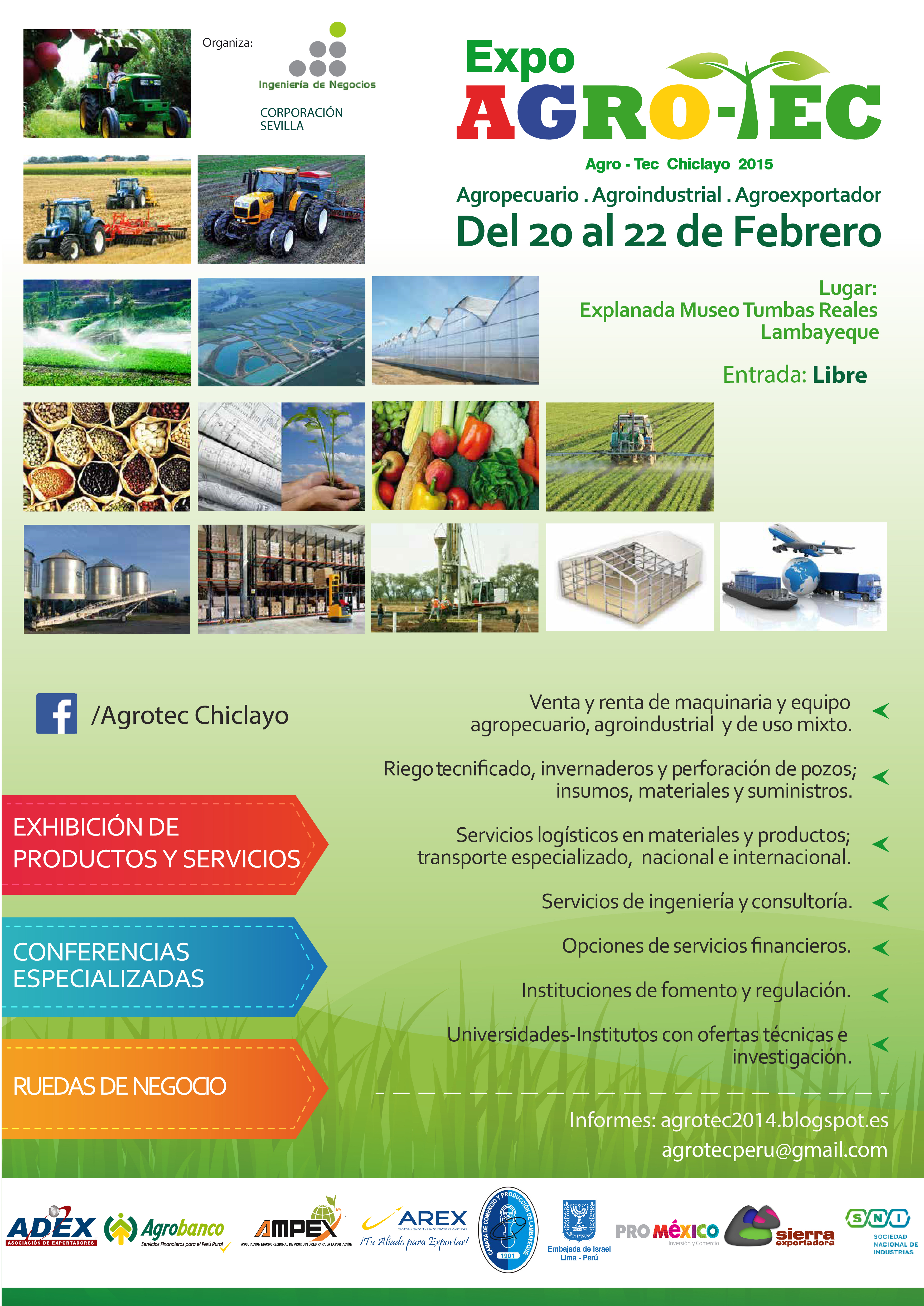 AGRO-TEC CHICLAYO 2015 es una exposición de tecnologías para el agro que reúne a las principales empresas de productos y servicios vinculados a la cadena de suministro de los sectores agropecuario, agroindustrial y agroexportador. En este evento, las empresas expondrán lo último en tecnología de las marcas más reconocidas del mundo y presentarán también una amplia gama de servicios para el mercado objetivo.