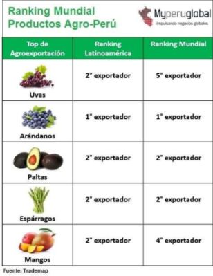 Perú se consolida como exportador regional y mundial de frutas y aparece en los primeros lugares del ranking. El país es el mayor exportador de arándanos del mundo y el segundo más importante en la exportación de espárragos y paltas. En cuanto a mangos y uvas, Perú es el segundo exportador latinoamericano y el cuarto y quinto exportador mundial, respectivamente.