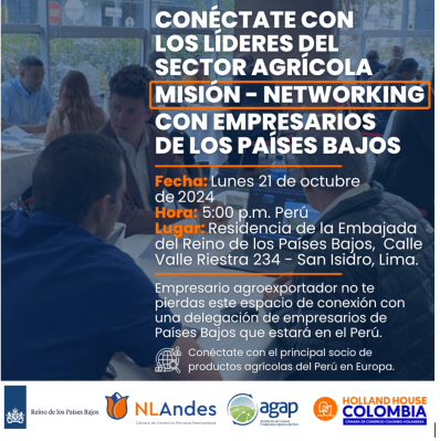 La misión comercial es organizada por la Embajada del Reino de los Países Bajos en Lima y la Cámara de Comercio Peruano Neerlandesa – NLAndes, en colaboración con AGAP. Se trata de una oportunidad única para fortalecer el desarrollo agrícola en Perú.